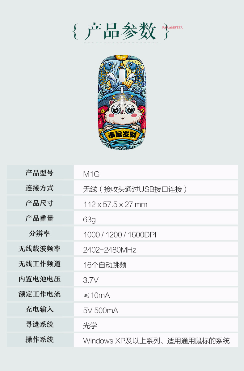 • 商品名称:【国潮国风联名款】英菲克M1G奉旨发财无线可充电式鼠标静音无声便携男女生可爱文艺笔记本台式电脑游戏办公