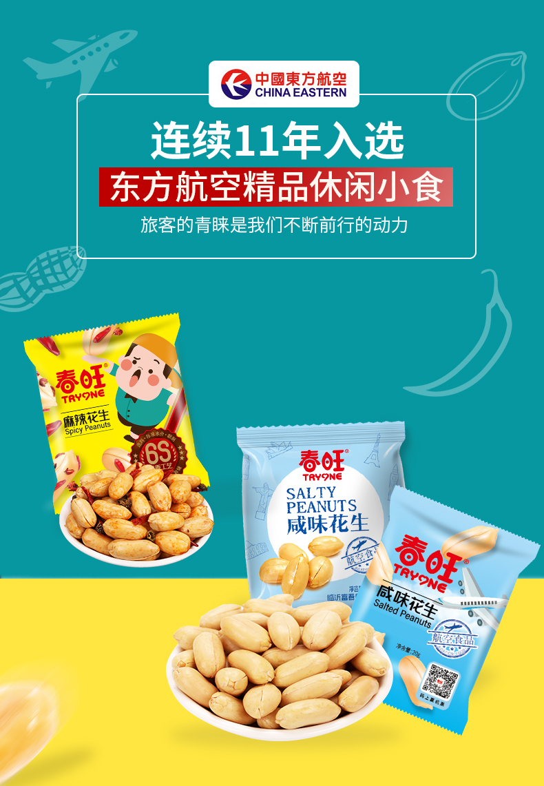 • 商品名称:春旺航空花生 麻辣熟飞机咸味椒盐淮盐花生米下酒菜零食40包袋装